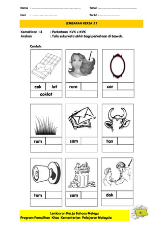 LEMBARAN KERJA BAHASA MELAYU PROGRAM PEMULIHAN KHAS BAHAGIAN PENDIDIKAN KHAS. LEMBARAN KERJA BAHASA MELAYU PROGRAM PEMULIHAN KHAS. Lembaran kerja pemulihan khas lembaran kerja kemahiran 4 suku kata terbuka kv Latihan VKVK 2 Latihan KVKVKV Latihan Sukukata KVKV Latihan KVKVK.